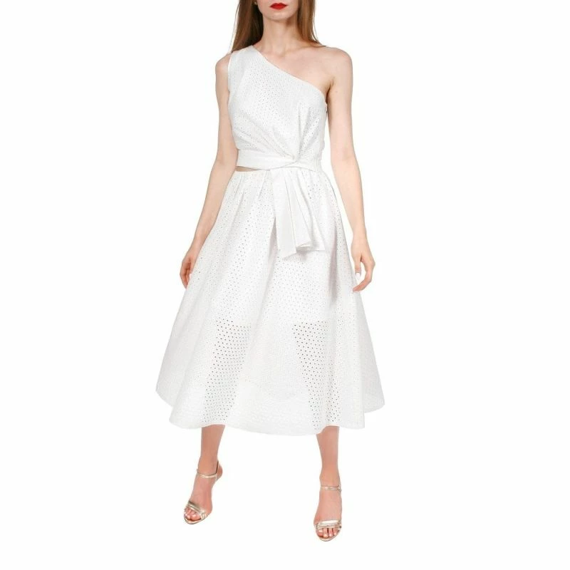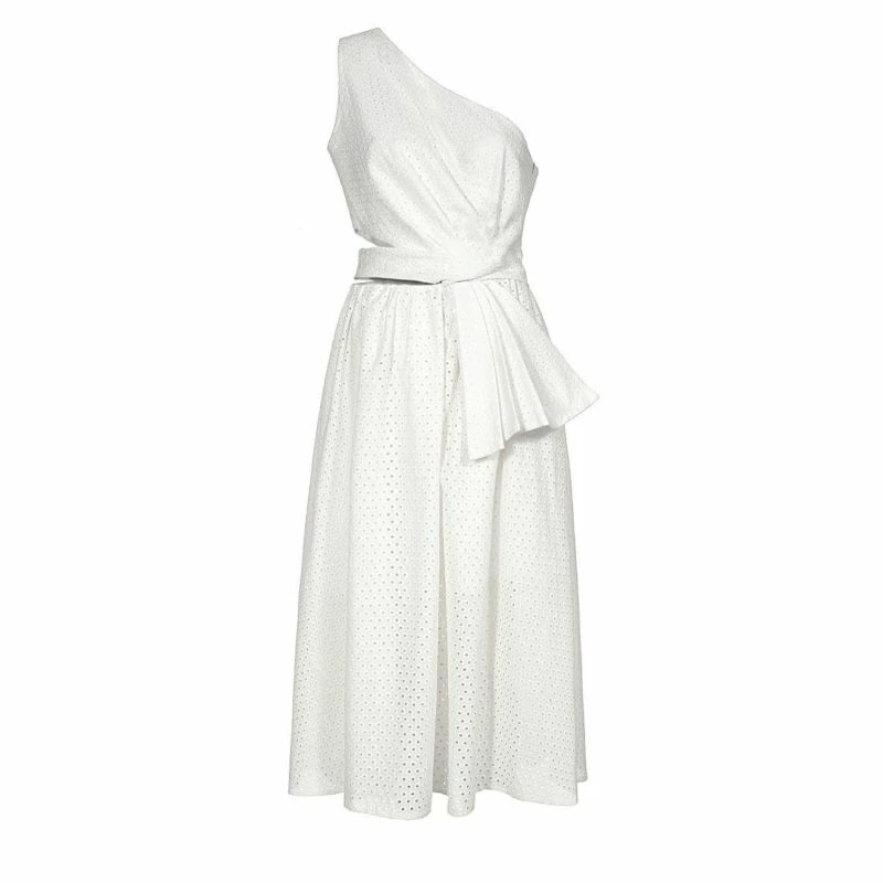 Asymmetrical cut revealing one shoulder and a fragment of the waist.