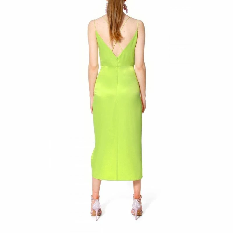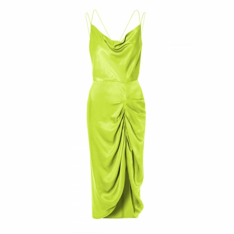 Midi length broke by a high, heavily draped crack on the left thigh.