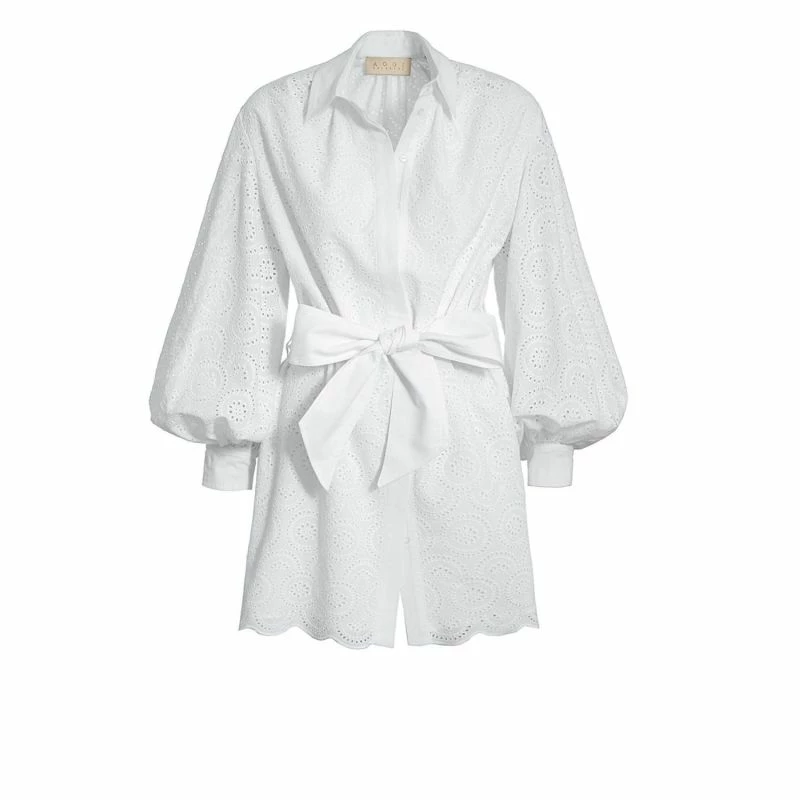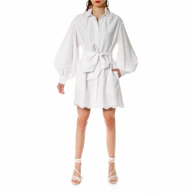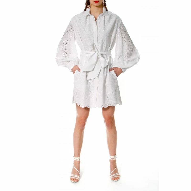 Small, pointed collar, waist fastened with a wide sash type belt, hidden pockets in side seams.