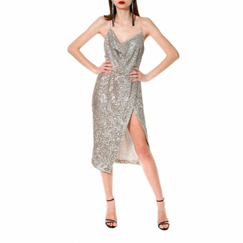 High cut on the left thigh. Very deep cut back with thin crossed straps.
