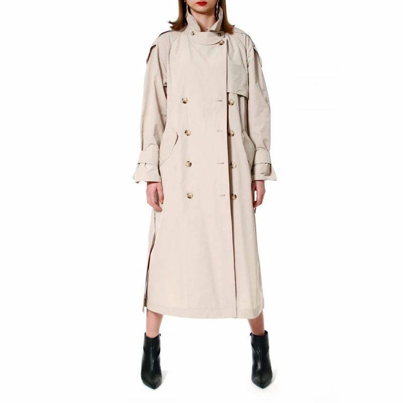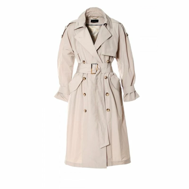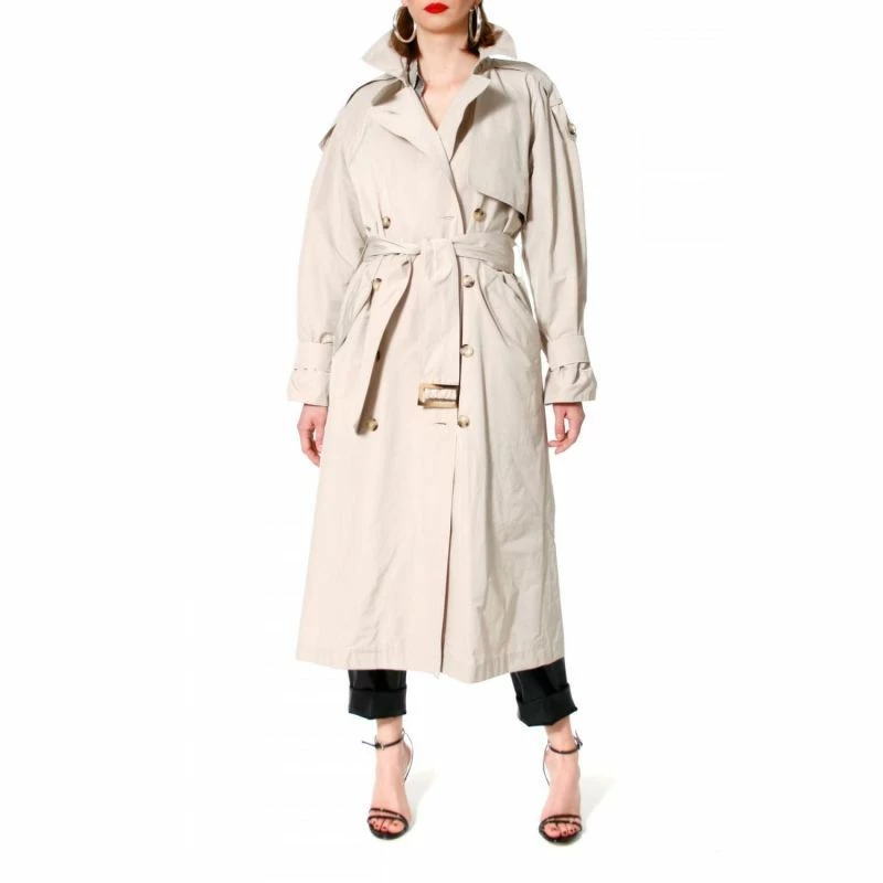 Double-breasted tortie button closure, wide lapels, belt with buckle are the basis for many styling possibilities.