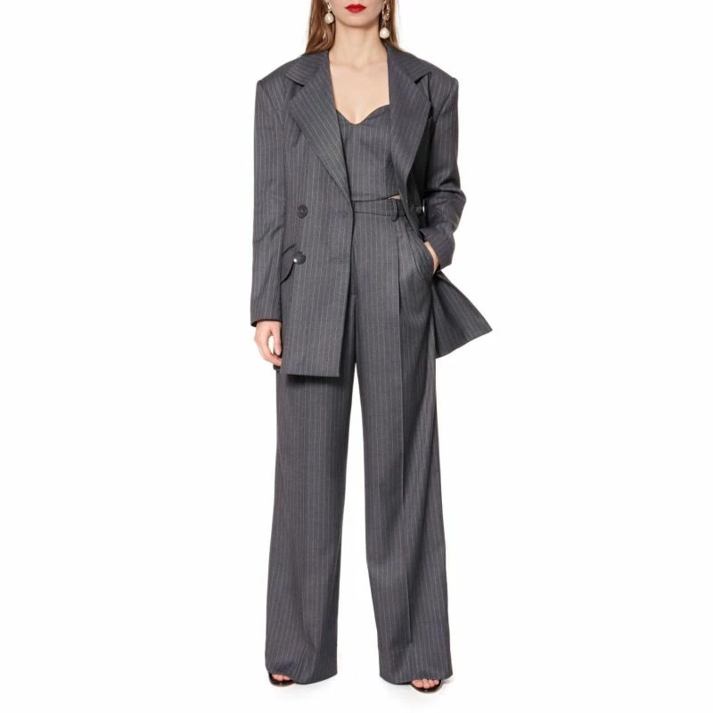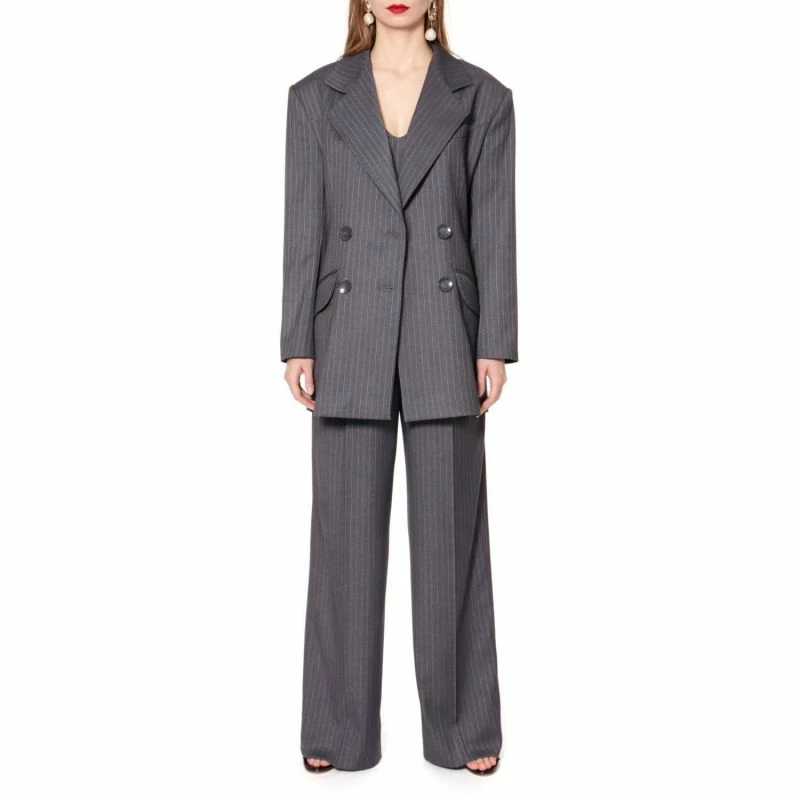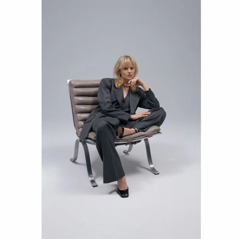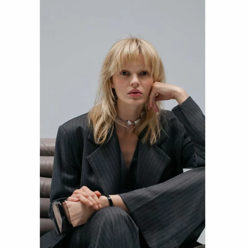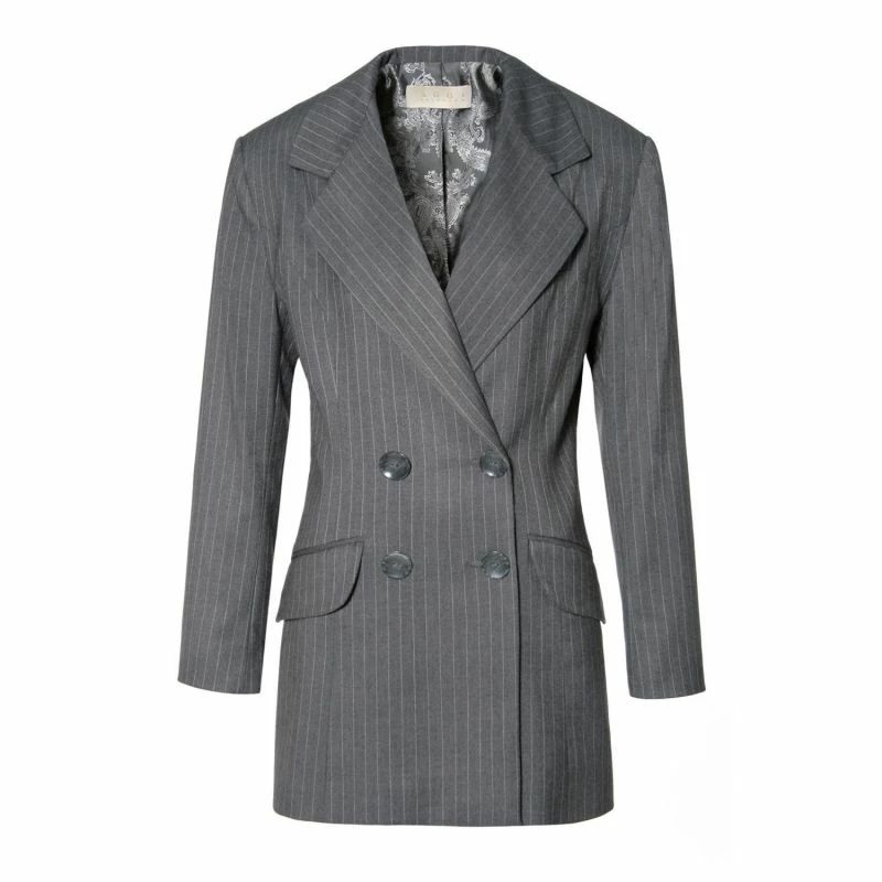 A long, striped tennis jacket with a strongly marked, slightly exaggerated shoulder line. Double-breasted fastening with beautiful large pearl-grey buttons that break the masculine nature of the design. All on a beautiful jacquard paisley lining. The design is one of the elements of a four-piece suit – match it with GWEN pants, SIENNA vest and LARA corset.