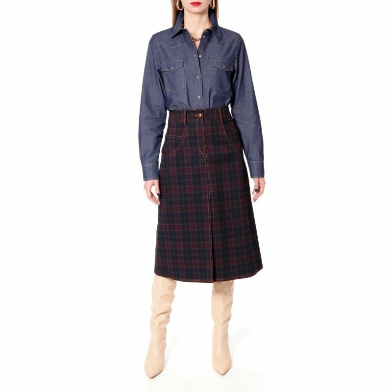 Cotton denim shirt in a classic, elegant shade of navy blue. Decorative stitching contrasting with the dark fabric and tiny gold-coloured metal press studs give the raw denim shirt a glamorous look. Shirt made of soft medium-thick denim.