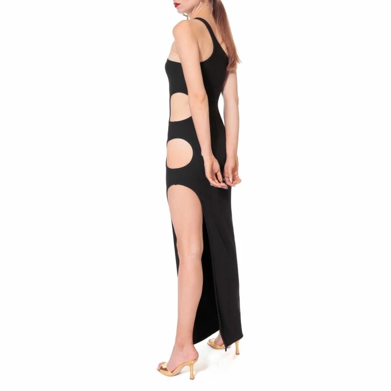 Asymmetrical maxi dress with sensual cutouts partially revealing the waist and hip and strongly exposing the leg.