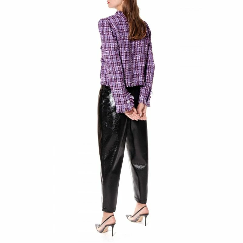 Tweed fabric made of yarn of different thicknesses in two shades of purple, broken with white, which creates the structural texture of the jacket.
