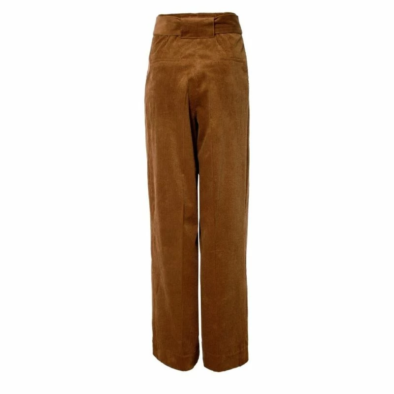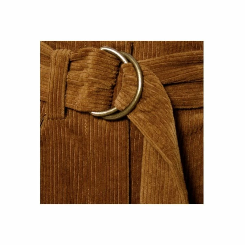 Wide corduroy pants with pleats on the front. An old gold strap with a buckle at the waist. With side pockets, belt loops and cut pockets with a tab at the back.