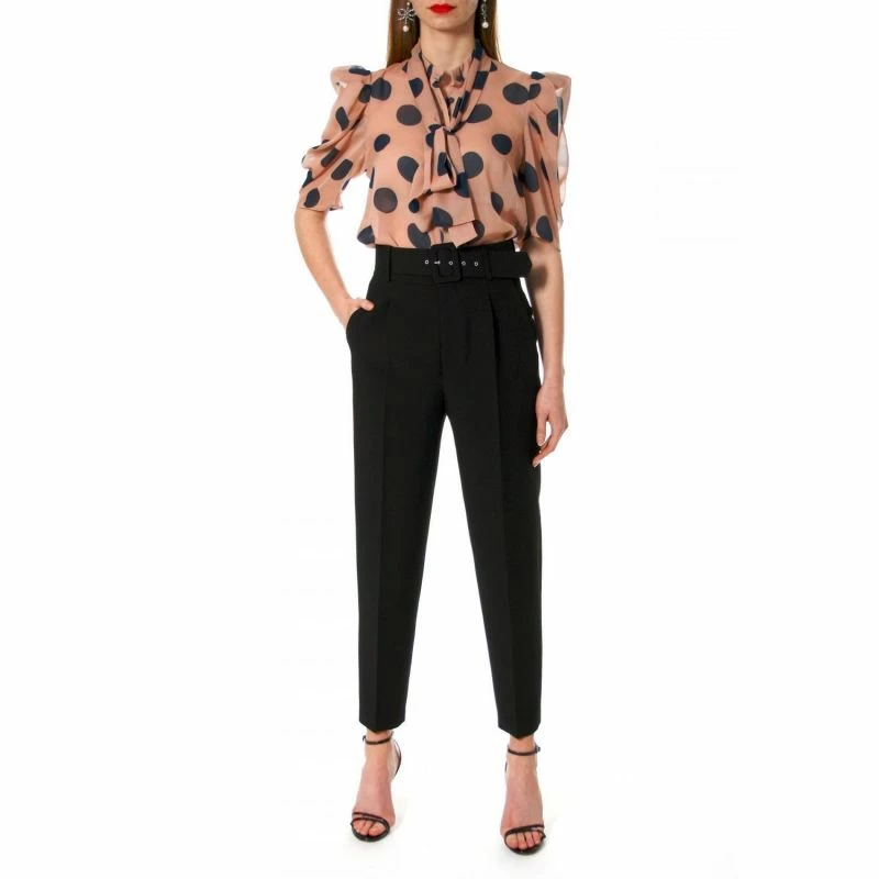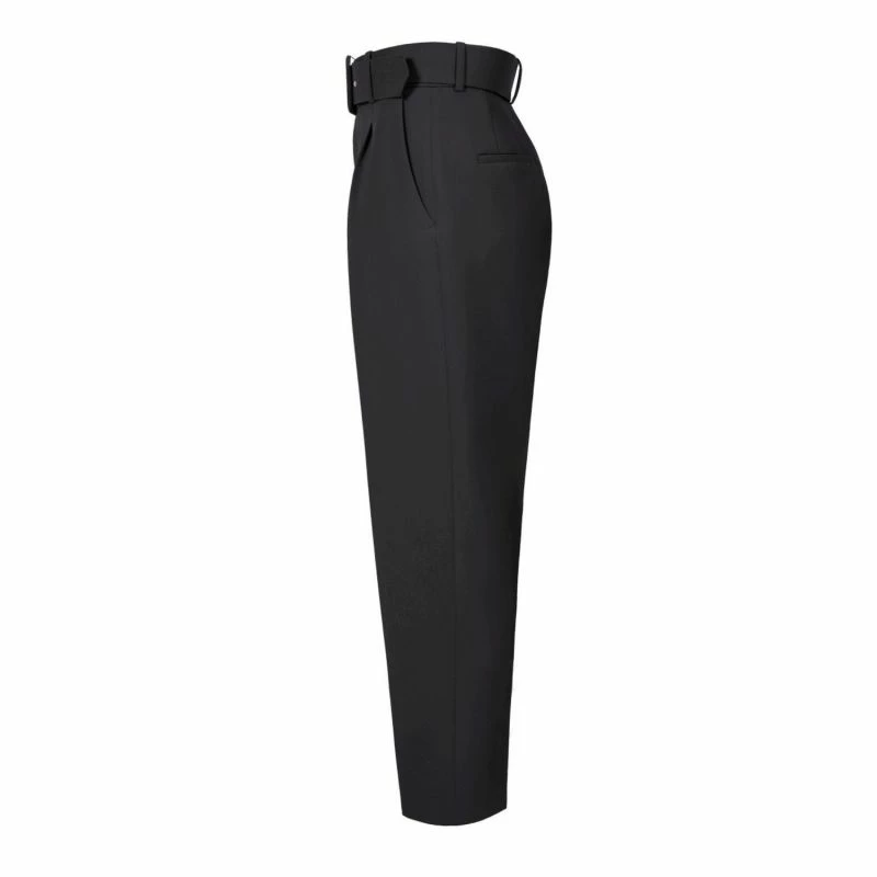 The waist is emphasized by a belt with a covered fabric buckle. With comfortable side pockets.
